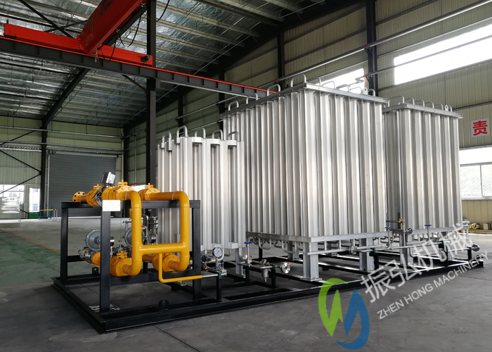 汽化調壓撬槽車(chē)或集裝箱罐車(chē)運送來(lái)的液化天然氣,通過(guò)卸車(chē)增壓氣化器將運輸車(chē)內的液體加壓,卸至LNG儲罐儲存,卸車(chē)不影響加注,也可以利用低溫潛液泵直接卸車(chē)。加液時(shí),利用儲罐增壓系統,將儲罐的壓力提高,利用壓差將LNG壓出。LNG通過(guò)低溫潛液泵加壓到1.0MPa以上,經(jīng)過(guò)加液機給汽車(chē)加氣。